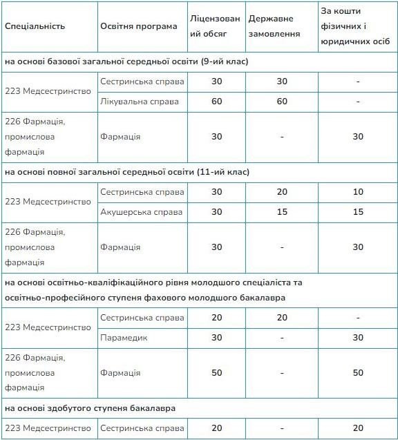 Ліцензійні обсяги, освітні програми та регіональне замовлення, за якими оголошується прийом на навчання до КЗВО «Волинський медичний інститут»