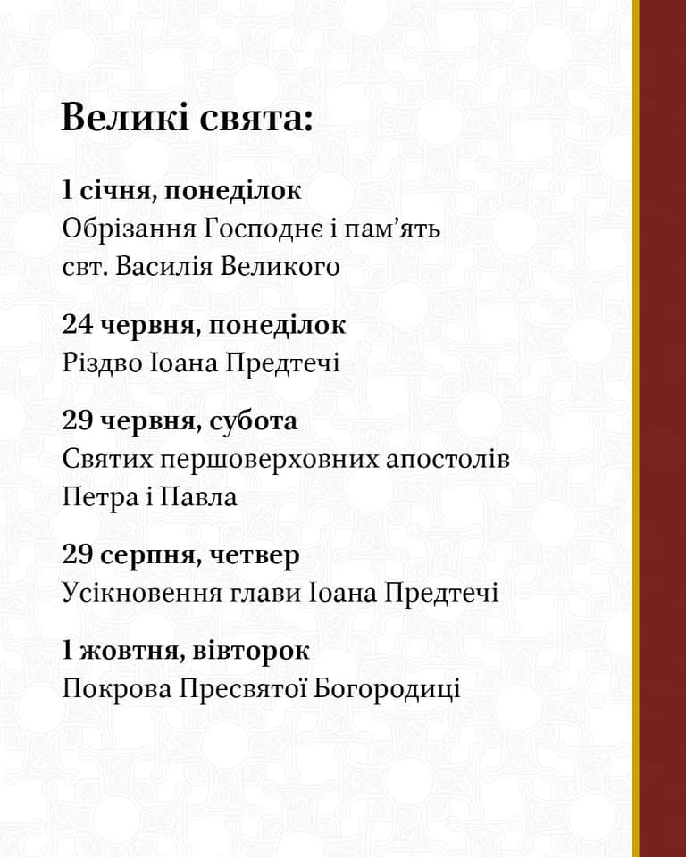 Із 1 вересня, з початком церковного новоліття, Православна Церква України переходить на новоюліанський календар. Таким чином реалізовується відповідне рішення найвищої владної соборної інституції церкви – Помісного Собору.