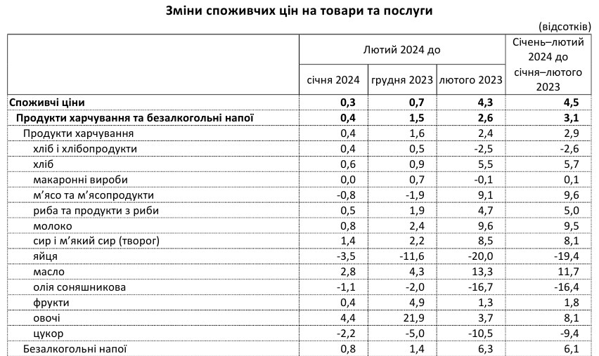 Середні ціни на продукти харчування в Україні в лютому 2024 року, порівняно з лютим минулого року, зросли на 2,6%. За останній місяць продукти подорожчали на 0,4%.