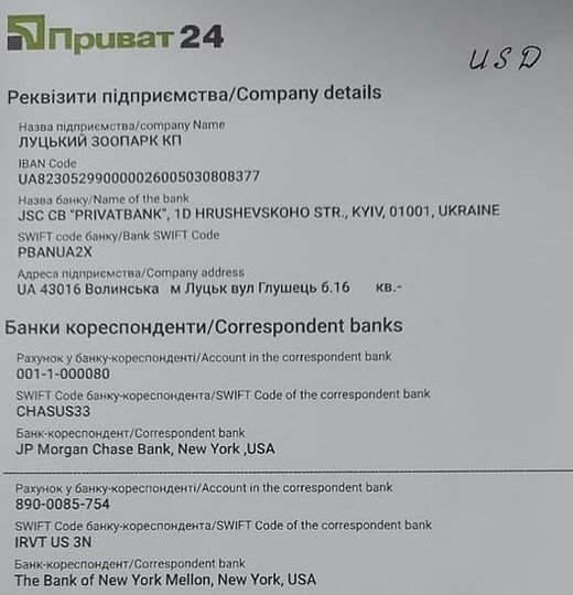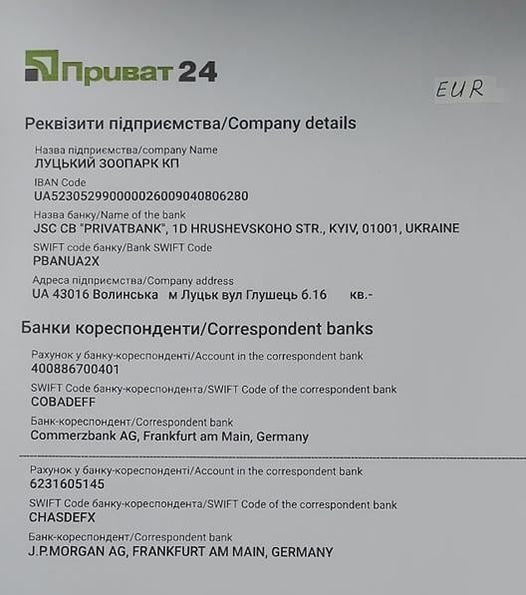 AT КБ «ПРИВАТБАНК» (ЄДРПОУ банку 14360570, код банку 305299) благодійний рахунок № UA70 305299 00000 26008030808200 (поточний рахунок), валюта UAH (українська гривня). КП ЛУЦЬКИЙ ЗООПАРК КОМУНАЛЬНЕ ПІДПРИЄМСТВО, ЕДРПОУ 31572273.