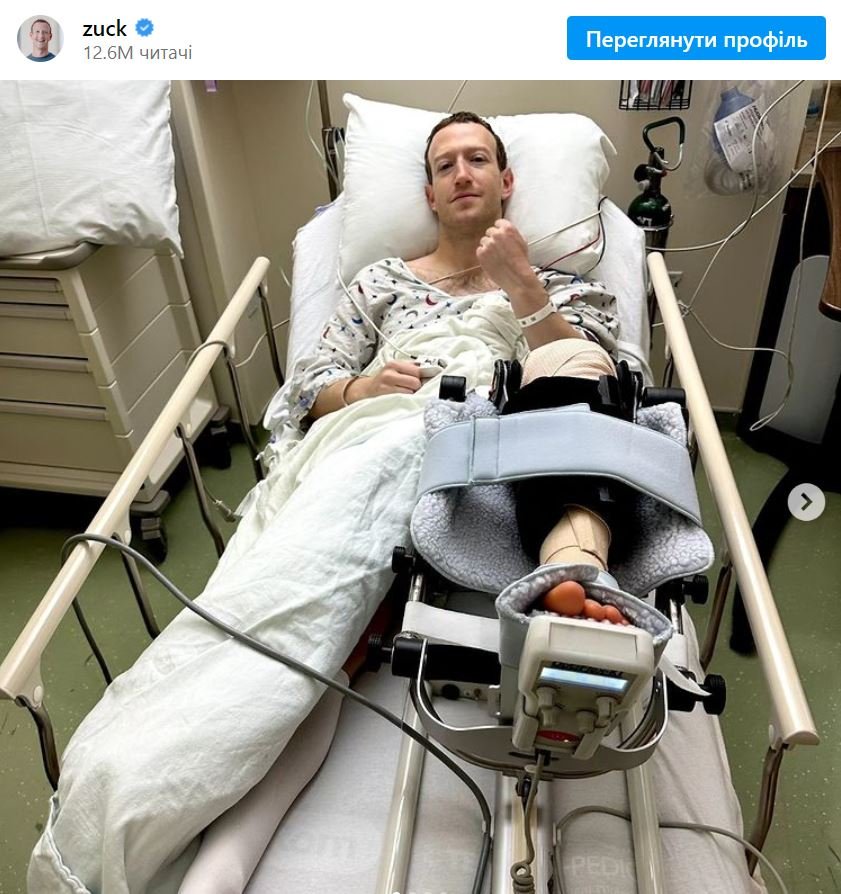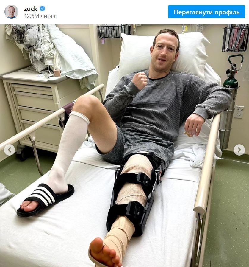 Цукреберг зазначив, що порвав хрестоподібну зв’язку коліна під час спарингу та опублікував фото з лікарні після операції.