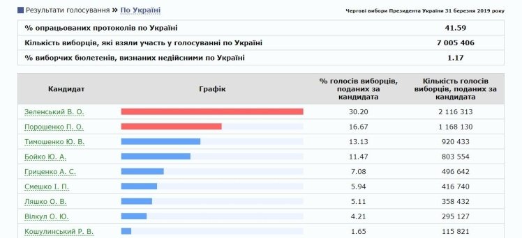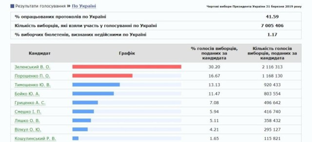 За цими даними на першому місці із 30,20% голосів йде Володимир Зеленський, на другому – Петро Порошенко з 16,67%. Трійку лідерів закриває Юлія Тимошенко із 13,13%. Про це йдеться на сайті ЦВК.