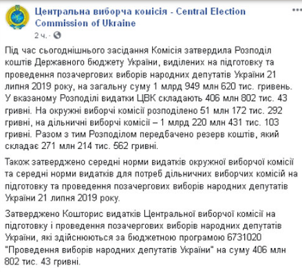 «На сьогоднішньому засіданні комісія затвердила розподіл коштів державного бюджету України, виділених на підготовку і проведення позачергових виборів народних депутатів України 21 липня 2019, на загальну суму 1 млрд 949 млн 620 тисяч гривень», — йдеться в повідомленні ЦВК.