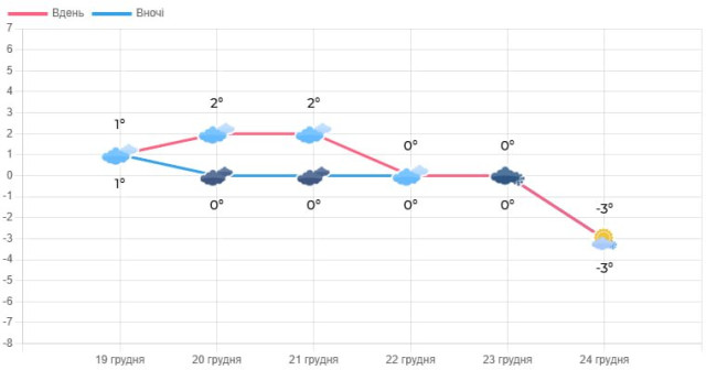 21 грудня прогнозують хмарну погоду. Без опадів. Вітер південний, 3-8 м/с. Температура повітря вночі – від 2° морозу до 3° тепла, вдень – 0-5° тепла.