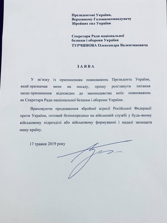 «Враховуючи продовження збройної агресії Російської Федерації проти України готовий безпосередньо на військовій службі у будь-якому військовому підрозділі або військовому формуванні і надалі захищати нашу країну», – зазначає секретар РНБО.