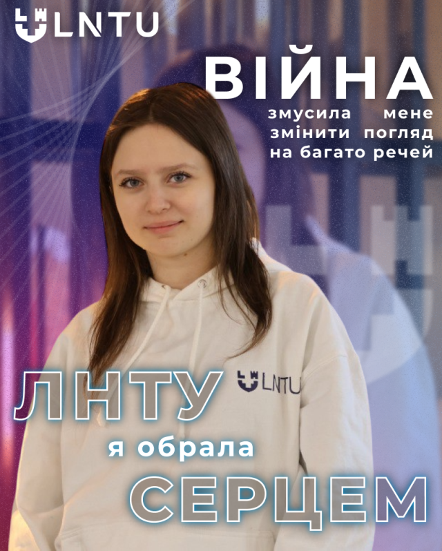 «Я довго не могла визначитись із ЗВО. Але коли розпочалось повномасштабне вторгнення, захотіла залишитися ближче біля дому. І побачила, як потужно, патріотично і згуртовано діє ЛНТУ в перші дні. Це був для мене знак. І жодного разу не пошкодувала. Зараз я дивлюсь на стіни університету й розумію, що вони стали моїми. І що буде дуже важко з ними прощатися».