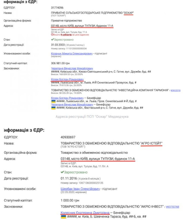 На підтвердження злиття агробізнесів Медведчука та Колесника видання наводить той факт, що низка ключових підприємств АСТ-холдингу Колесника ТОВ «Агро Істейт», ТОВ «Інновагро», ТОВ «Технагро», ТОВ «Монтеверде» стали мати спільну юридичну адресу з більшістю агропідприємств Медведчука, які зареєстровані на вулиці Тулузи 11А у Києві. Більше того, з огляду на те, що фізично знайти будівлю чи приміщення за такою адресою неможливо, журналісти дійшли висновку, що ця адреса – віртуальна «яма» для реєстрації підприємств.