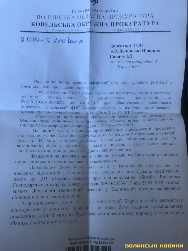 У жовтні 2020 року Ковельська місцева прокуратури Волинської області скерувала до суду обвинувальний акт у кримінальному провадженні стосовно директора Ковельської філії Державного підприємства «Укрветсанзавод».