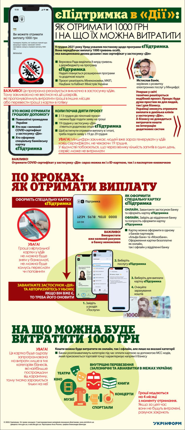 Виплату може отримати виключно громадянин України, який досяг 18 років і має в застосунку Дія «зелений» COVID-сертифікат вакцинації. Ініціював програму з виплати тисячі гривень вакцинованим українцям президент Володимир Зеленський.Із 13 грудня стартував пілот програми «єПідтримка», який дозволить отримати тисячу гривень за вакцинацію проти коронавірусу. Із 16 грудня люди, які зареєструвалися у пілотному проєкті через мобільний застосунок Дія, почали отримувати кошти. Для отримання виплати необхідно зареєстуватися у Дії, а також оформити картку в одному з банків-партнерів (наразі це – Альфабанк, А-банк, Монобанк, Приватбанк, Укргазбанк). Про участь у програмі «єПідтримка» також заявив і Ощадбанк. Список банків-партнерів поповнюватиметься у міру їх підключення до «єПідтримки».
