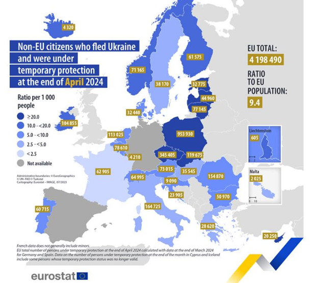 У країнах Євросоюзу на кінець квітня 2024 року статус тимчасового захисту мали майже 4,2 млн громадян країн, що не входять до ЄС та які залишили Україну внаслідок повномасштабної війни. На кінець березня таких було 4,21 млн людей.