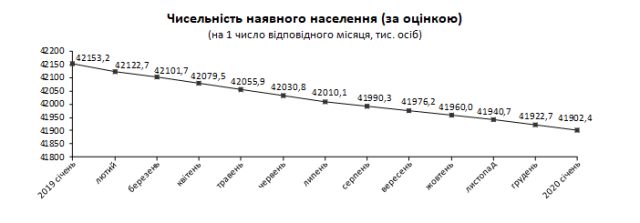 «Чисельність населення в Україні, за оцінкою на 1 жовтня 2020 року, становила 41 703,3 тис. осіб. Упродовж січня-вересня 2020 року чисельність населення зменшилася на 199,1 тис. осіб», – йдеться в повідомленні.