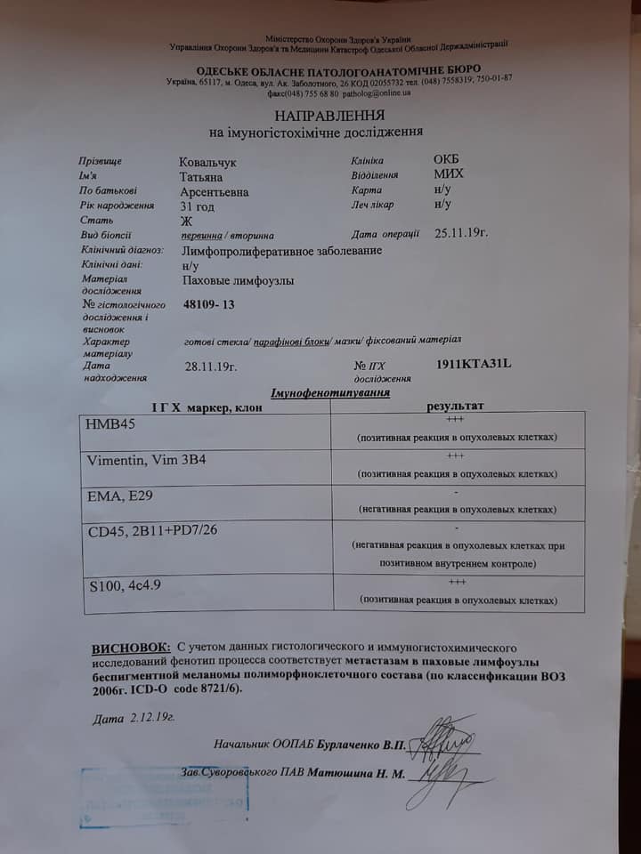 «Спершу думали, що то запалення лімфовузлів. Але лікуванню це не піддавалося, – розповідає Тетяна. – Тоді нам сказали зробити біопсію, медики запідозрили рак. На жаль, меланома підтвердилася. Метастази уже пішли в лімфовузли».