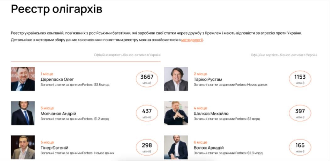 До реєстру ввійшли дані про 53 олігархів з рейтингу «200 найбагатших бізнесменів» російського Forbes за 2021 рік, а також низки інших росіян, які перебувають під українськими санкціями та є бенефіціарами бізнесу в Україні.