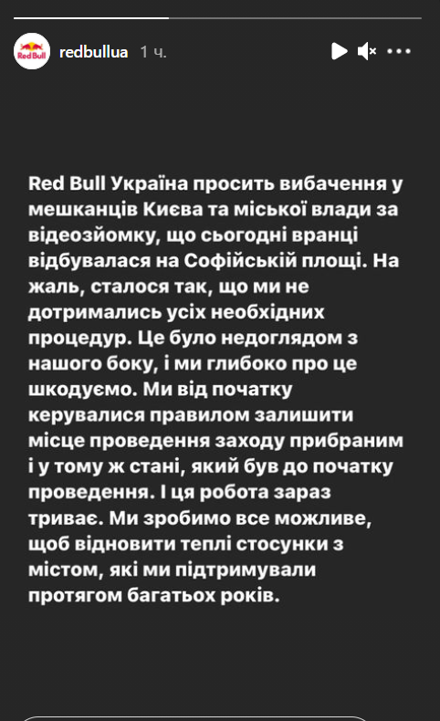 «Red Bull Україна просить вибачення у жителів Києва та міської влади за відеозйомку, що відбувалася на Софійській площі. На жаль, сталося так, що ми не дотрималися всіх необхідних процедур. Це було недоглядом з нашого боку і ми глибоко про це шкодуємо», – йдеться у заяві компанії.