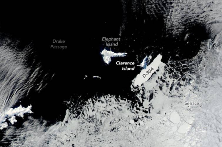 В Антарктиді айсберг D-30A завдовжки понад 70 км зіштовхнувся з островом Кларенс, де зазвичай розмножуються пінгвіни.