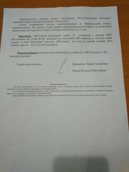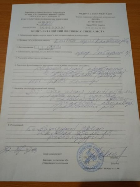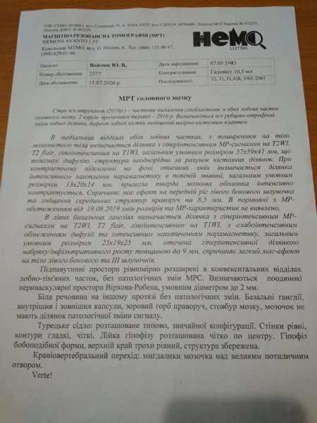 Повторна операція неможлива. Потрібне дороговартісне лікування (Авастин 92 000 грн, потім Темодал 23 000 грн та курс опромінення в інституті нейрохірургії ім. акад. А. П. Рамаданова в м. Києві). Ця сума є непідйомною для нашої сім’ї (троє діток віком 14, 12 та 4,5 роки. Молодша донька дитина-інвалід підгрупи А з діагнозом синдром Дауна)», – зазначила жінка.