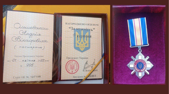 Указом президента України від 1 квітня 2025 року №205 орденом за мужність ІІІ ступеня посмертно нагороджено Ольшевського Андрія Вікторовича.