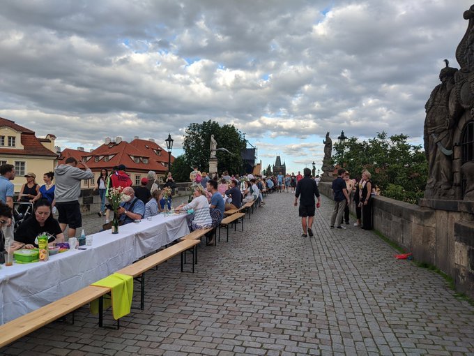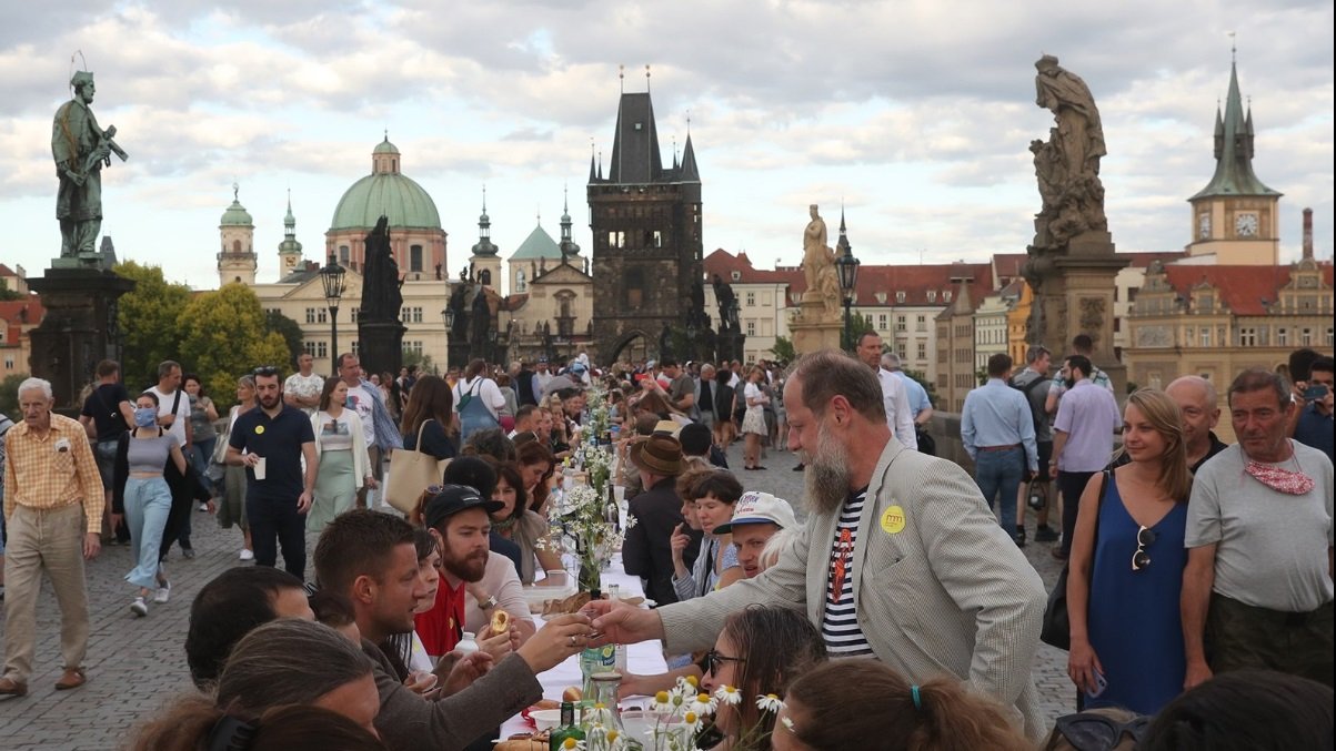 Тисячі гостей сиділи за 500-метровим столом на Карловому мосту і ділилися їжею та напоями, які вони принесли з дому.