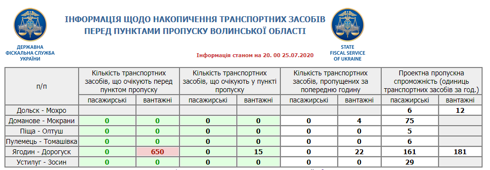 У пунктах пропуску «Доманове» та «Дольськ» черги відсутні.Як інформує Польське радіо, станом на 25 липня на польсько-українському кордоні на переході Дорогуськ-Ягодин вистроїлися довгі черги.