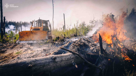 До ліквідації пожежі залучили п’ять одиниць важкої інженерної техніки для створення мінералізованих смуг – працюють бульдозери, трактори та важкі тягачі.Як уточнила Вікторія Рубан, горить знову в Чорнобильській зоні.