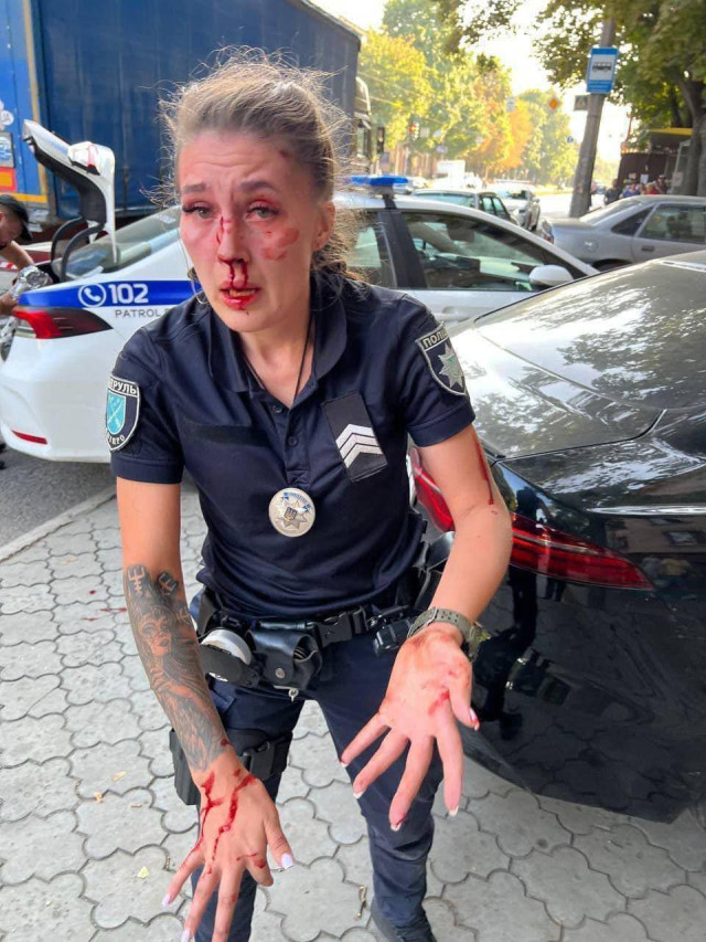 У Мережі писали, що патрульний вистрілив у чоловіка після того, як той напав на поліцейську. На фото видно, що жінці добряче дісталося під час бійки – її лице і руки повністю у крові.