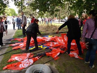 Приводом для масової бійки стали комуністичні прапори, які були помічені у колонні "Опозиційного блоку". Ветерани АТО вимагали прибрати це "ганчір'я", через що почались сутички.