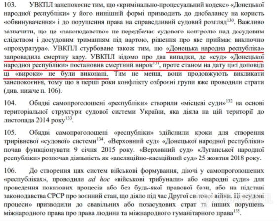 «УВКПЛ відомо про два випадки, де «суд» «ДНР» ухвалив смертний вирок, однак станом на дату цієї доповіді ці «вироки» не було виконано. Утім, вони продовжують викликати занепокоєння, адже в перші роки війни збройні групи вже проводили страти«, – йдеться в доповіді.Колишній ватажок терористів «ДНР» Ігор Гіркін (Стрєлков) в інтерв’ю українському журналістові Дмитрові Гордону зізнався в причетності до вбивства в квітні 2014 року українців Володимира Рибака, Юрія Дяковського та Юрія Поправки.