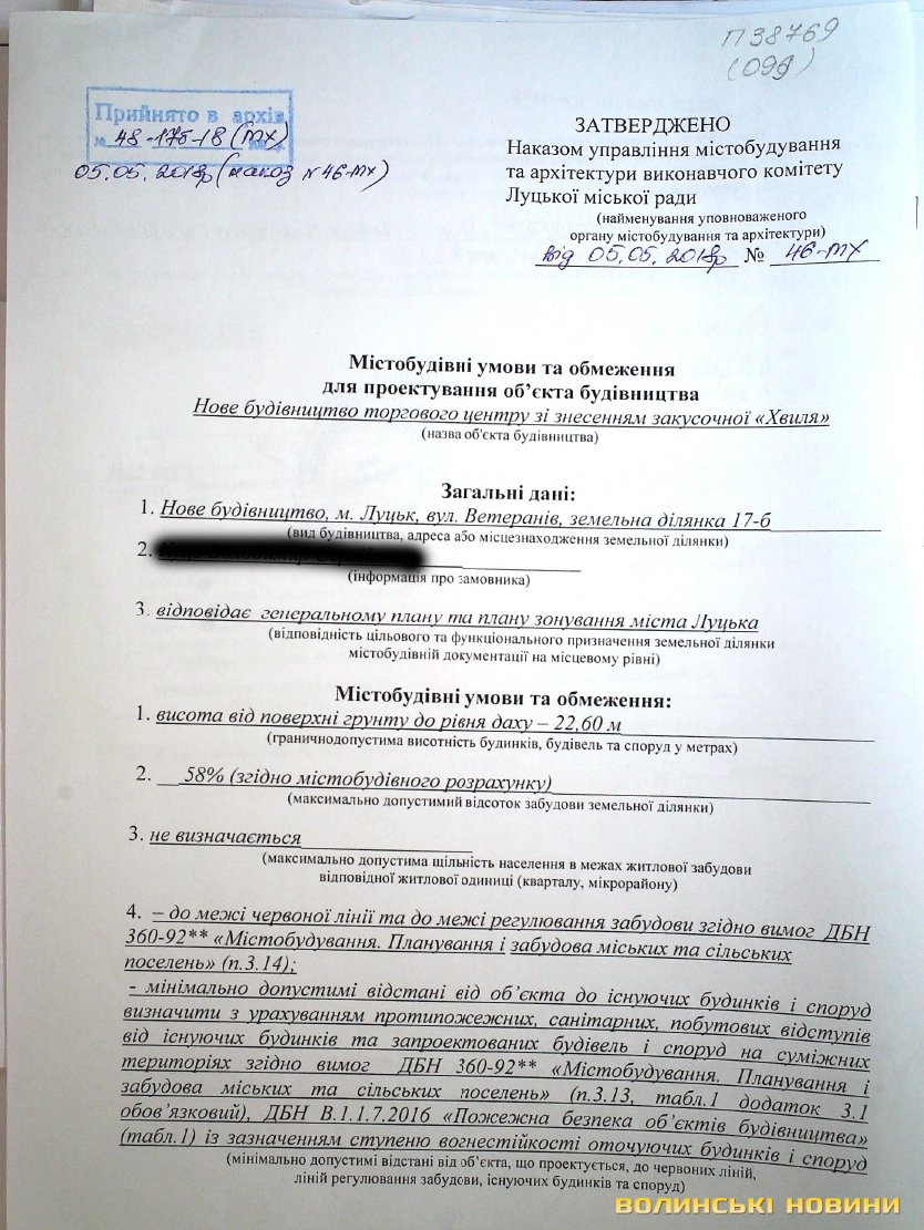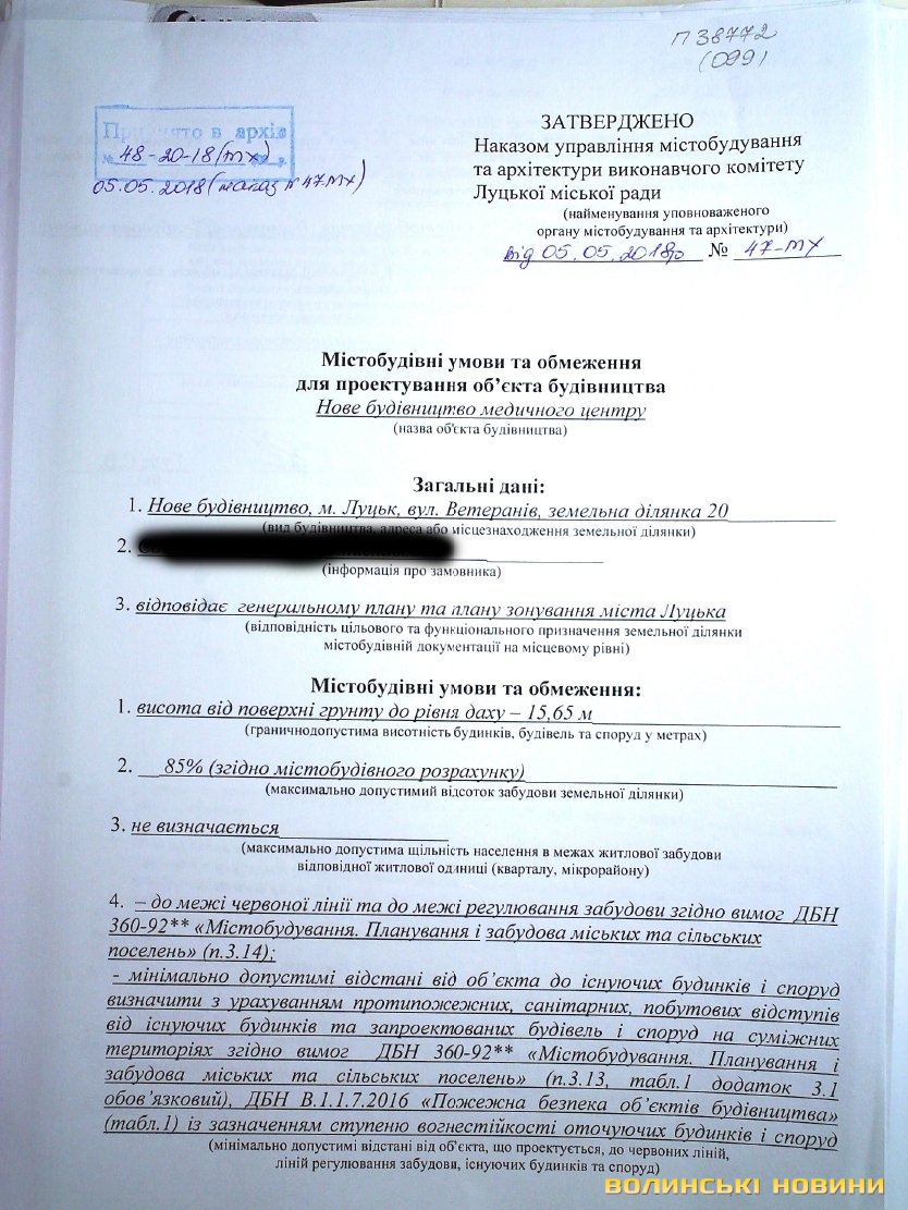 Начальник управління містобудування та архітектури Луцької міської ради Веніамін Туз розповідає: містобудівні умови та обмеження на ділянку за адресою вулиця Ветеранів 17-б були видані ще у 2018 році.