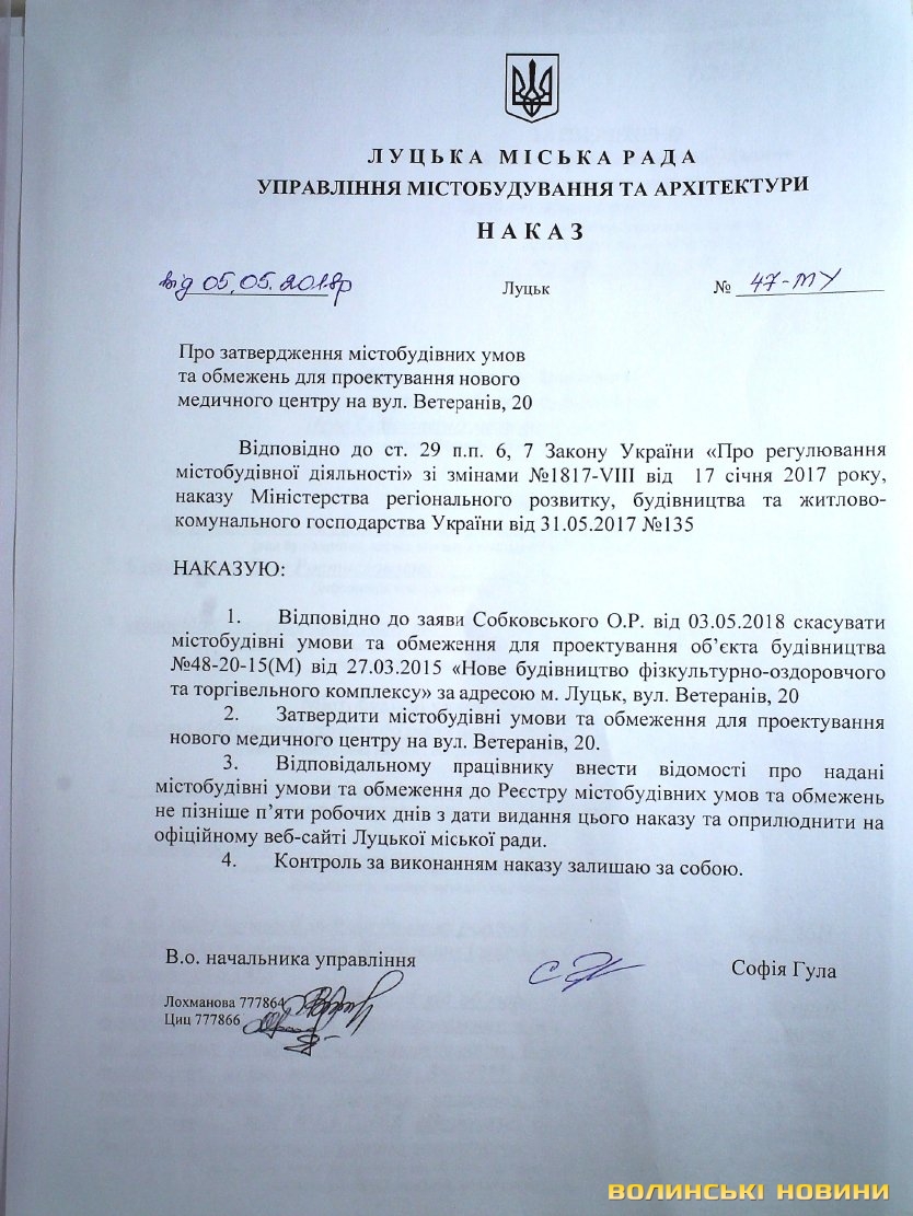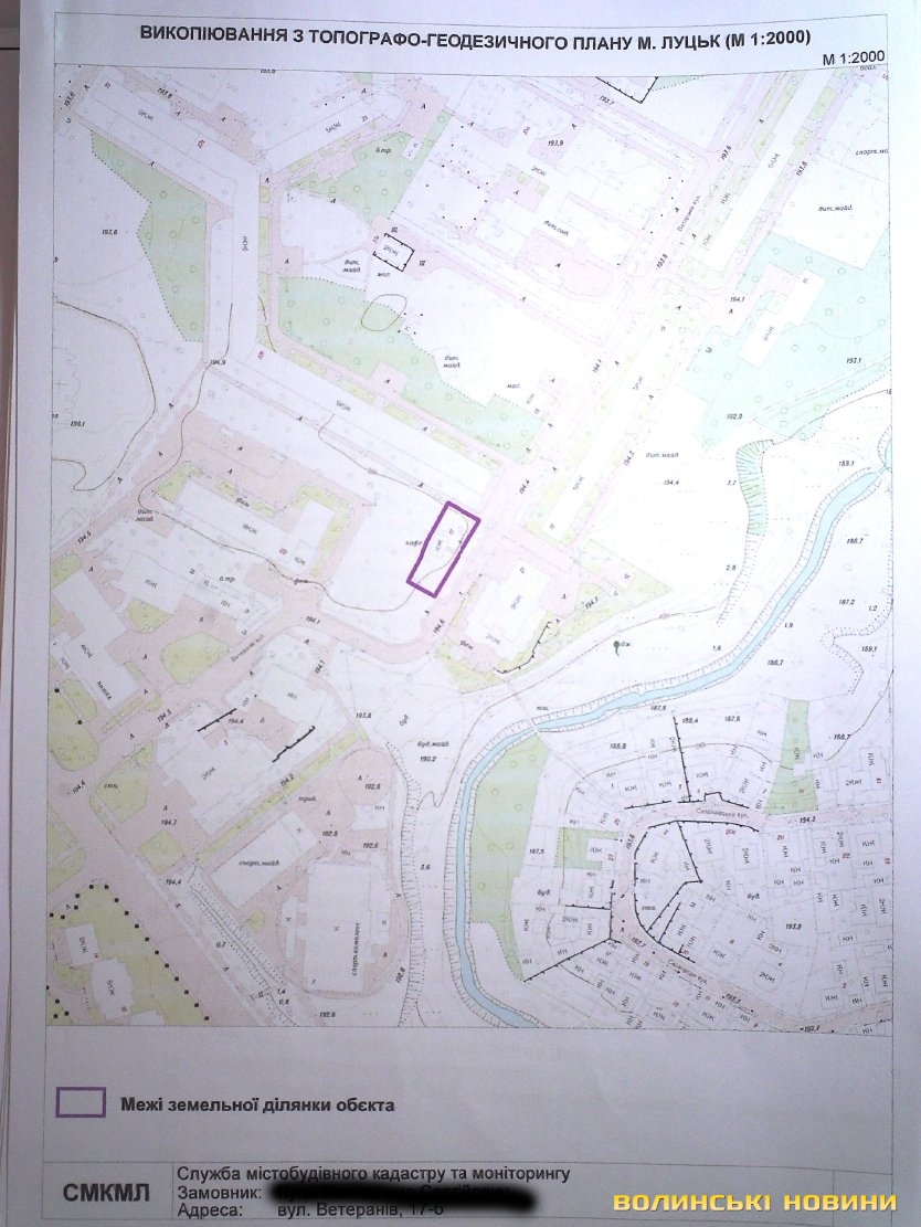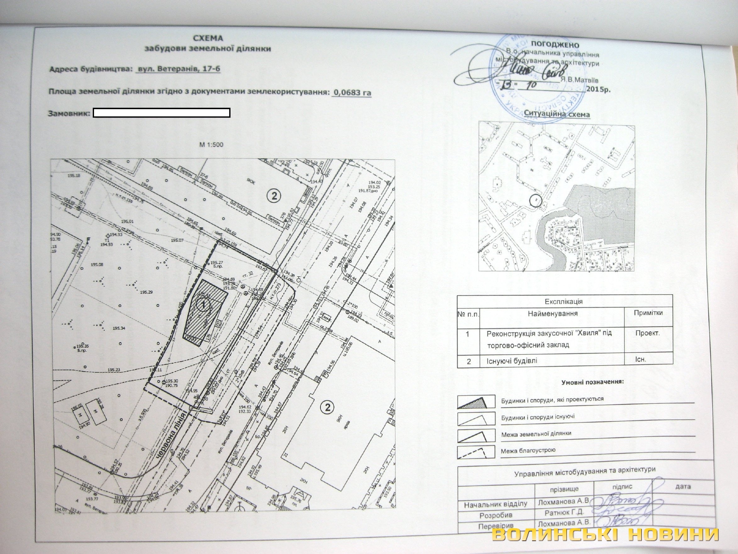 Головний спеціаліст відділу контролю за благоустроєм та санітарним станом міста департаменту муніципальної варти Луцької міської ради Тетяна Головій повідомила, що до департаменту вже надходили звернення за дозволом на проведення земельних робіт. З її слів, звернення надійшли від різних власників двох ділянок на вулиці Ветеранів: 17-б та 20. Для того, щоб отримати дозвіл, спеціалістам департаменту пред’явили документи на будівництво двох споруд: торгового і медичного центрів.Будівництво – без паспорта об’єкту