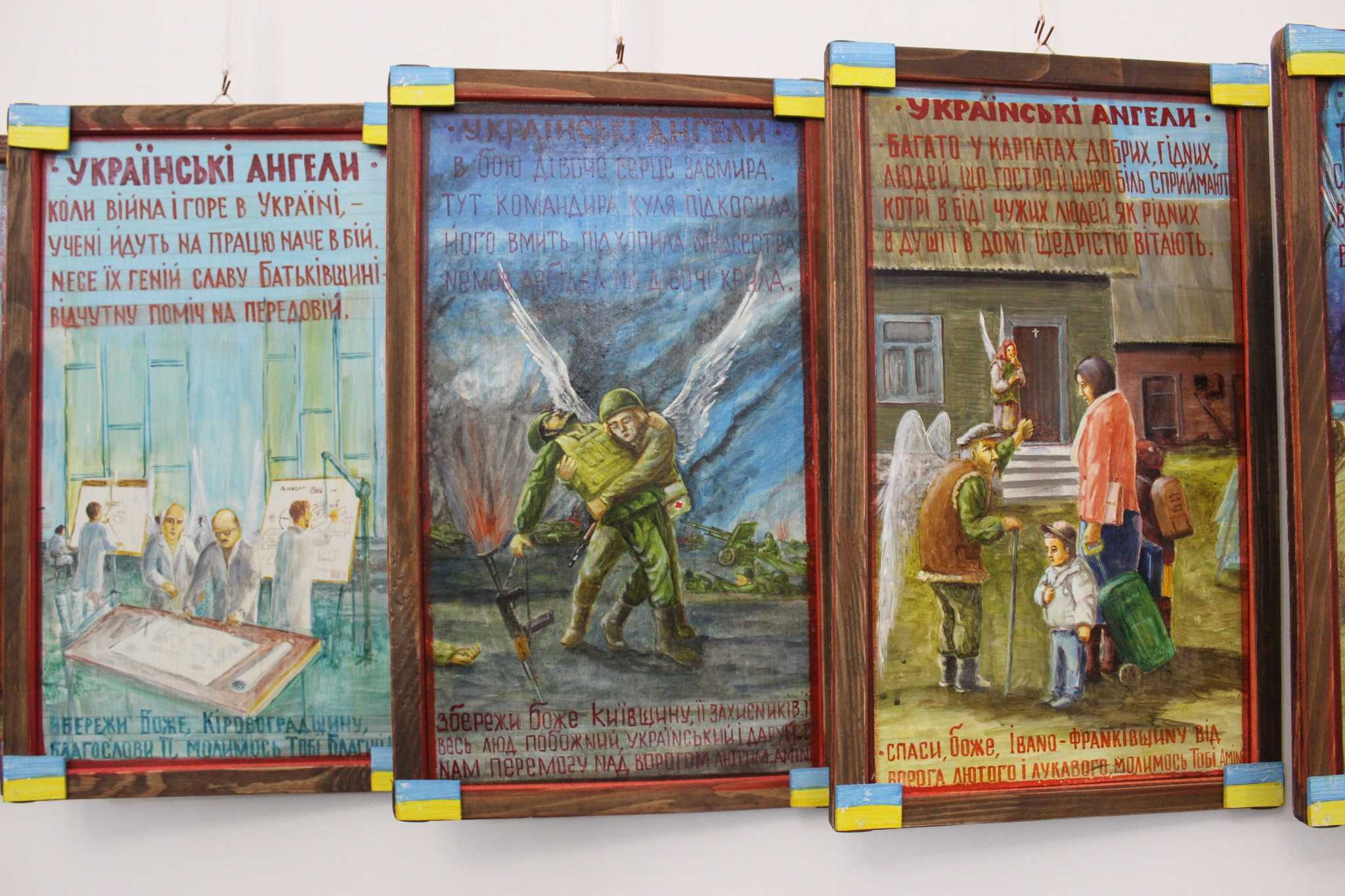 «Картини присвячені різним регіонам України та різним людям. Воїни, медики, рятувальники, кухарі, журналісти: кожен на своєму місті – ангел, який наближає перемогу, демонструє героїзм і на передовій, і в тилу», – розповідає автор.Однією з головних робіт виставки є авторська ікона отця Олександра, на якій зображені захисники української землі.У Дубенському замку патріотична виставка діятиме упродовж місяця.