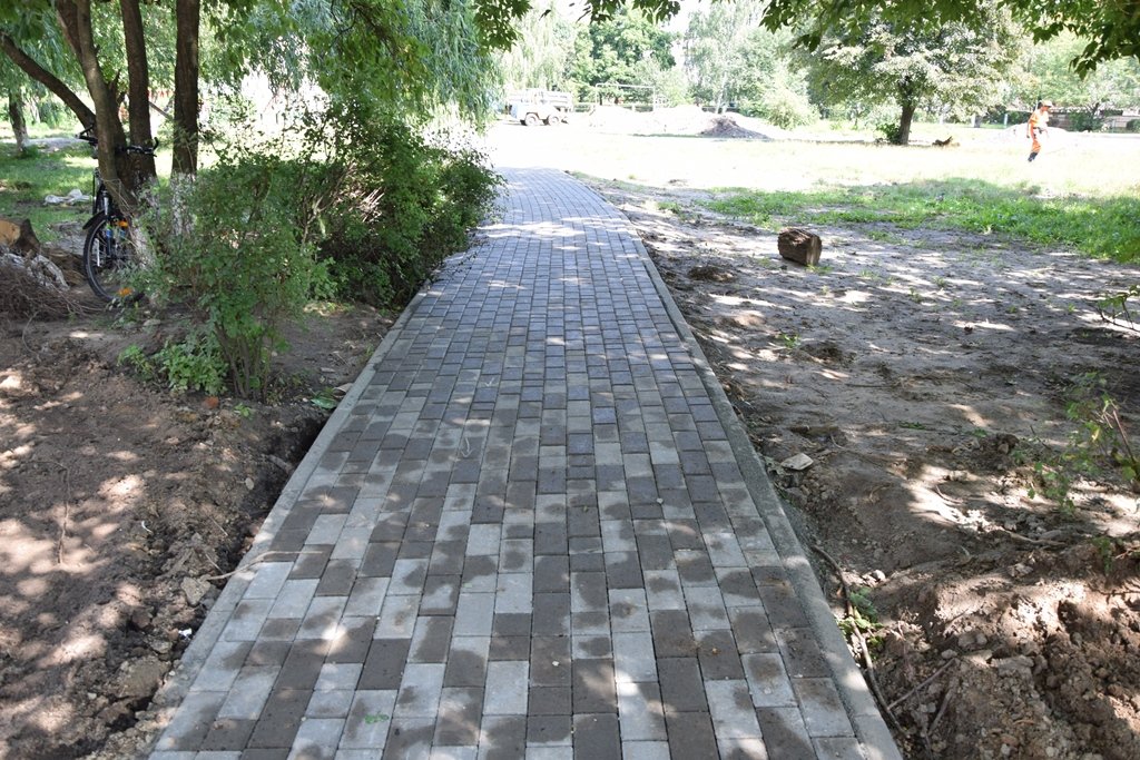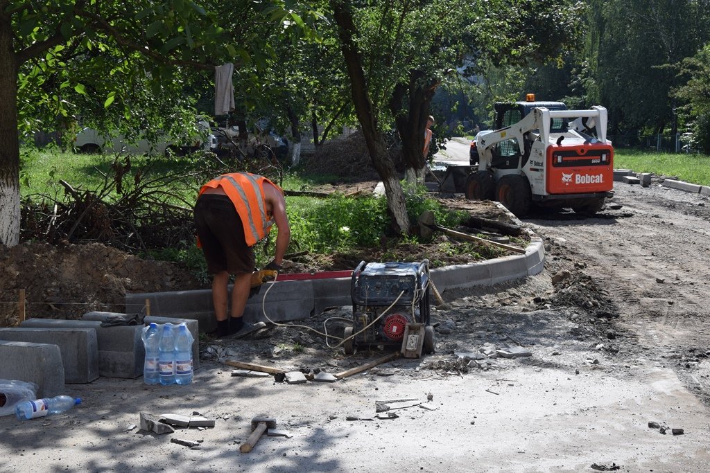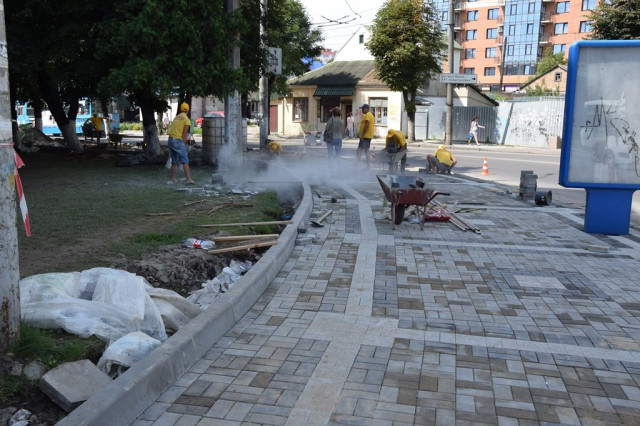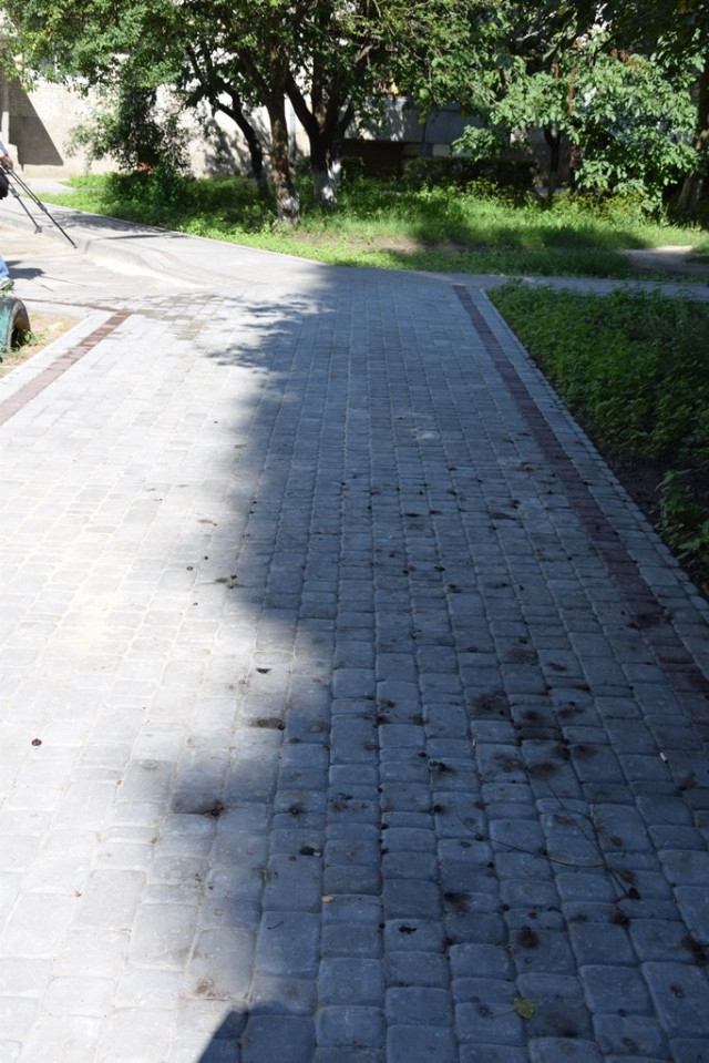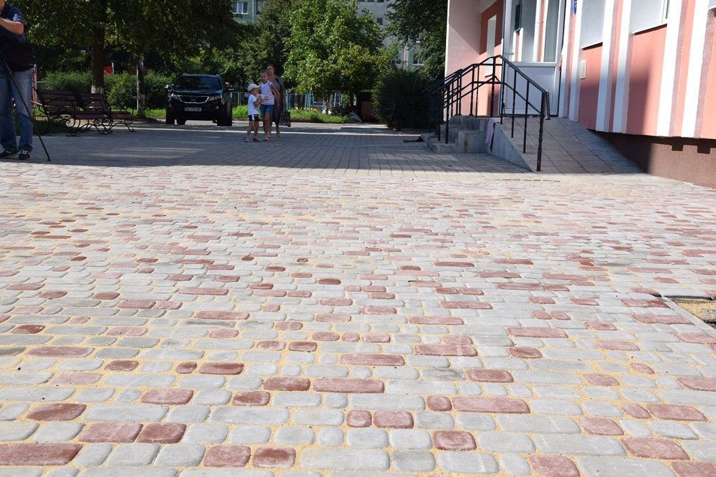 На стадії завершення перебувають роботи з облаштування бруківкою тротуарів та пішохідних доріжок на просп. Молоді, 13б. Було обладнане асфальтно-бетонне покриття, облаштована розвилка пішохідних доріжок.