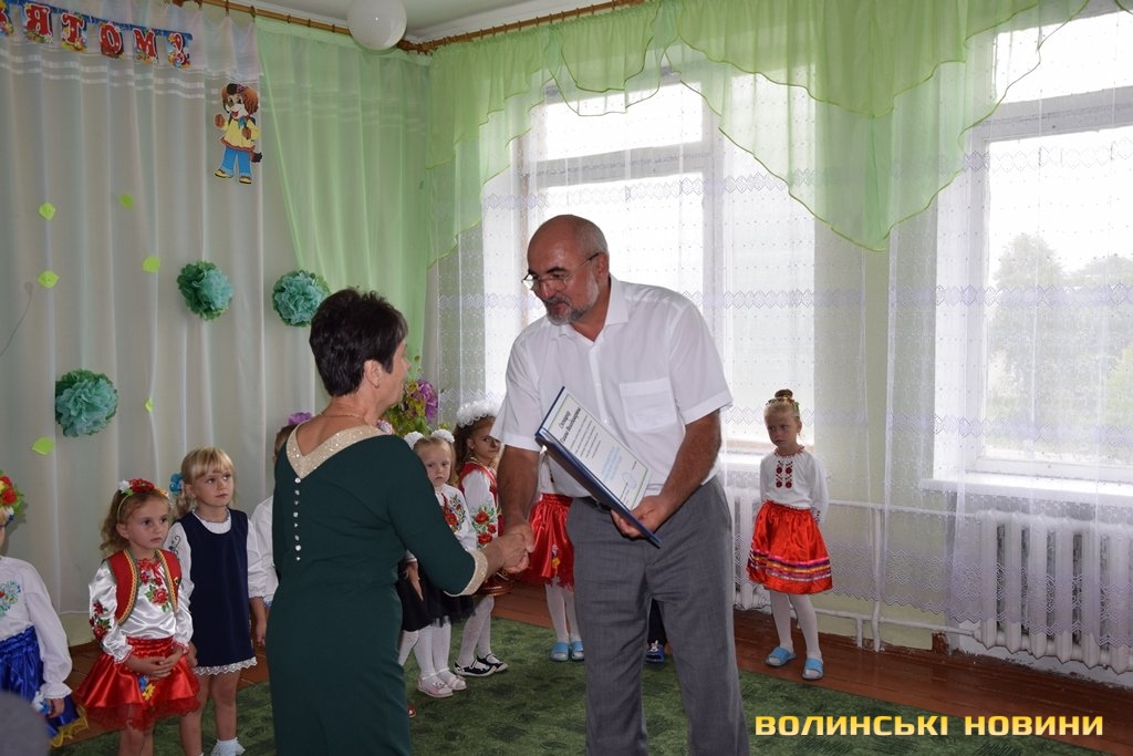 Роман Карпюк привітав усіх присутніх із відкриттям нової групи й успішним завершенням ремонтних робіт, а також нагородив завідувачку дитсадка Валентину Сосницьку почесною грамотою Волинської обласної ради.