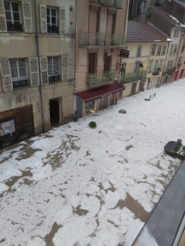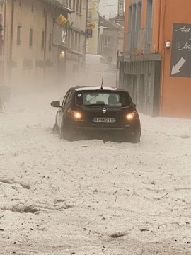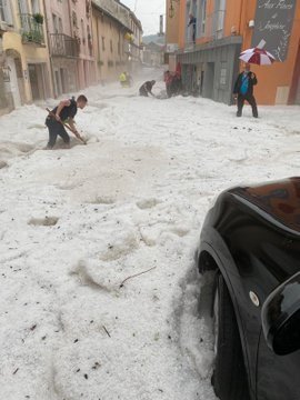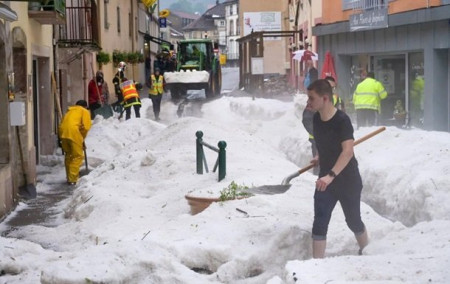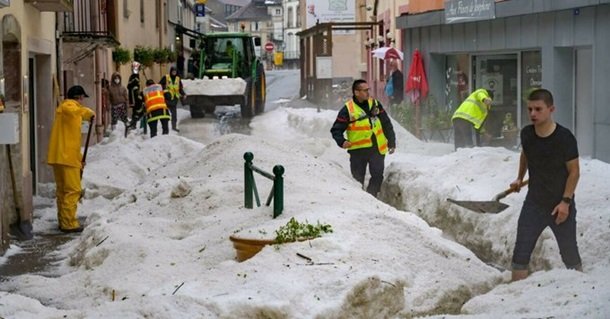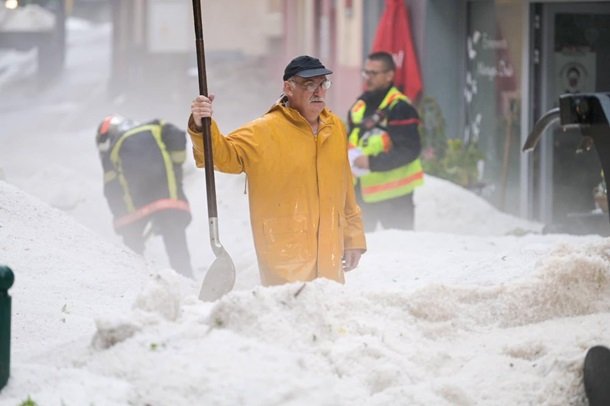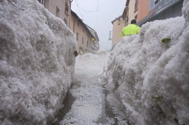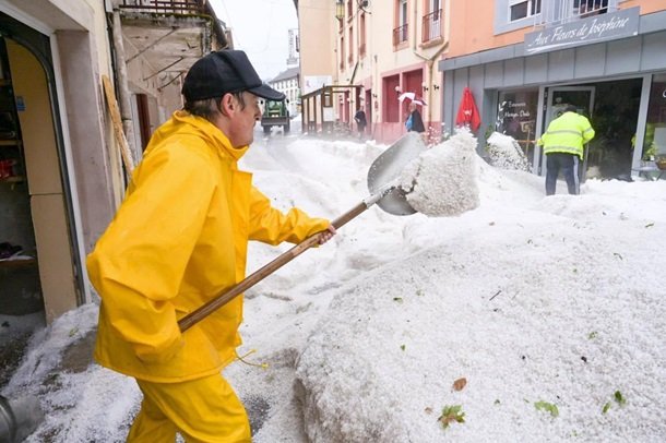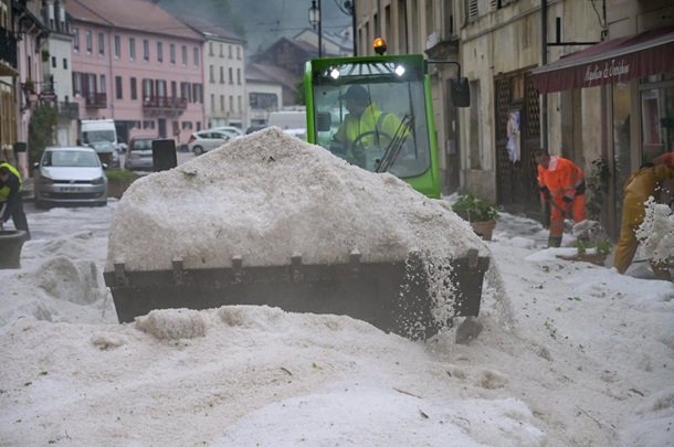 Жителям французького міста Пломб'єр-ле-Бен довелося снігоочисниками та лопатами розчищати вулиці міста після того, як їх вкрив товстий шар граду.