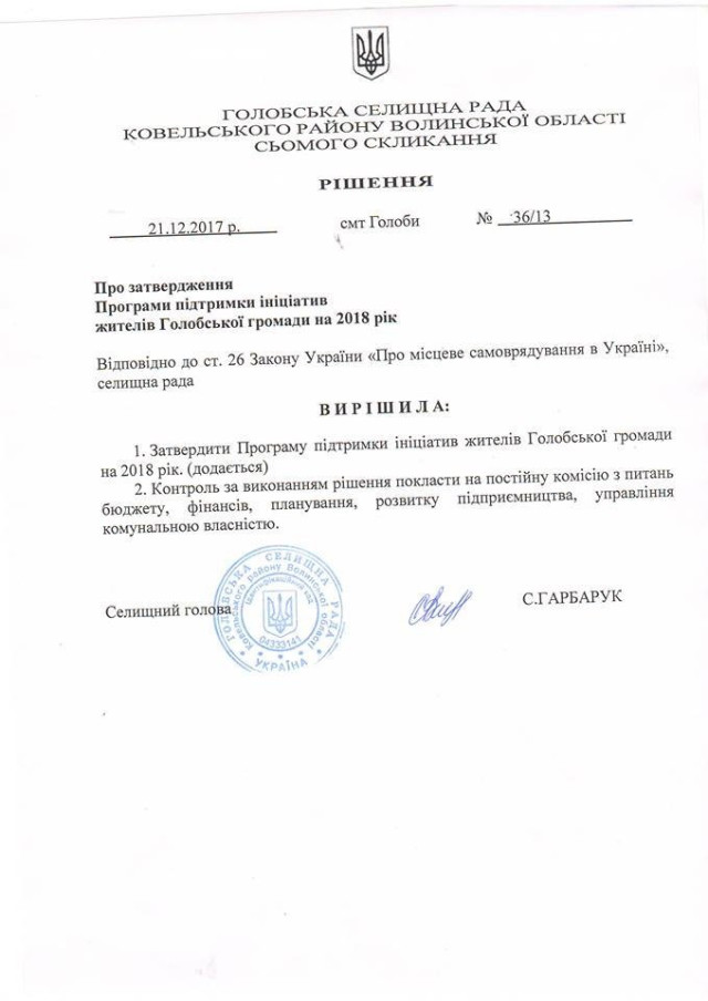 21 грудня 2017 року Голобська селищна рада затвердила програму підтримки місцевих ініціатив жителів на 2018 рік.