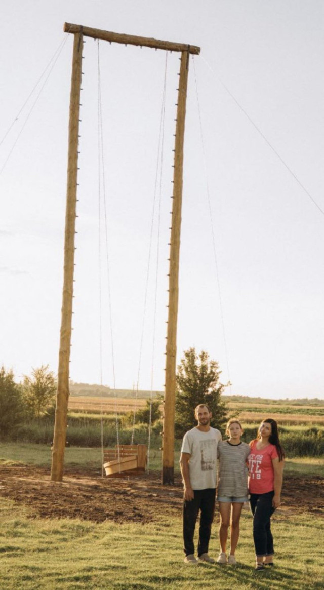 Висота гойдалки – 14 метрів 10 сантиметрів, розповіла Суспільному Катерина Веремчук. Її чоловік Юрій збудував атракцію неподалік місцевого контактного зоопарку, який створила родина.