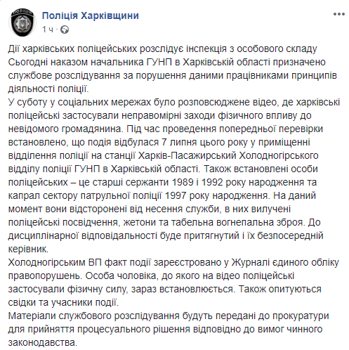 Раніше не було точно відомо, коли був записаний ролик. Так, поліція підтвердила, що відео дійсно було знято 7 липня в приміщенні відділення поліції на станції Харків-Пасажирський Холодногірського відділу поліції ГУНП області.