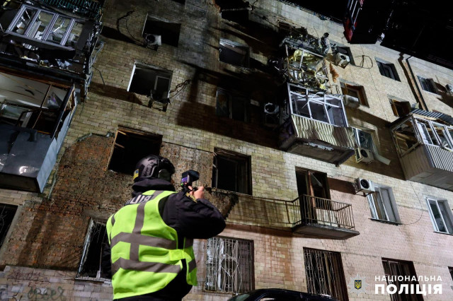 Поліцейські збирають речові докази воєнного злочину та документують наслідки влучання.