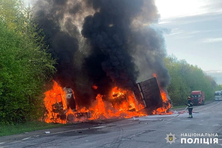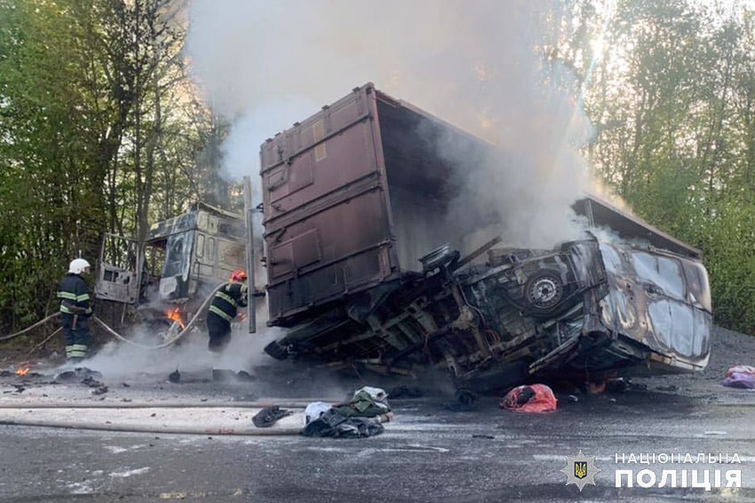 За попередніми даними, водій вантажного автомобіля «DAF» з причепом виїхав на смугу зустрічного руху, де зіткнувся з вантажним мікроавтобусом «Мерседес Спринтер» та легковим автомобілем «Опель Комбо». Причіп вантажного автомобіля перекинувся, притиснувши «Мерседес Спринтер» і «Опель Комбо».У результаті зіткнення усі транспортні засоби зайнялися. Рятувальникам вдалося локалізувати пожежу, після чого слідчо-оперативна група змогла приступити до огляду місця події.