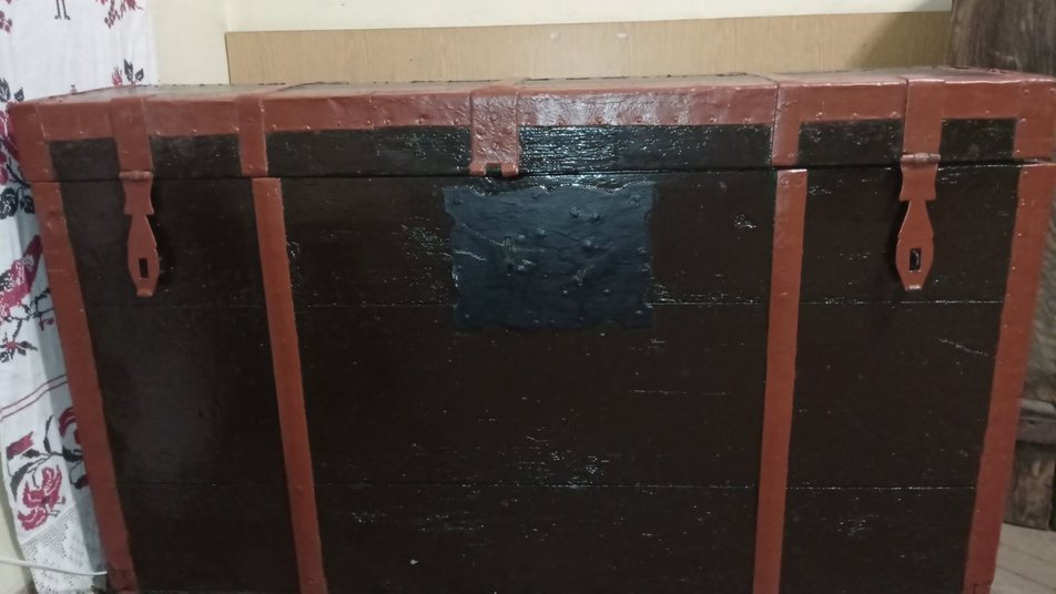 Скриня дерев’яна, пофарбована у темно-коричневий колір та має червоні металеві смуги, раніше вона зачинялася на ключ, повідомляє Суспільне.