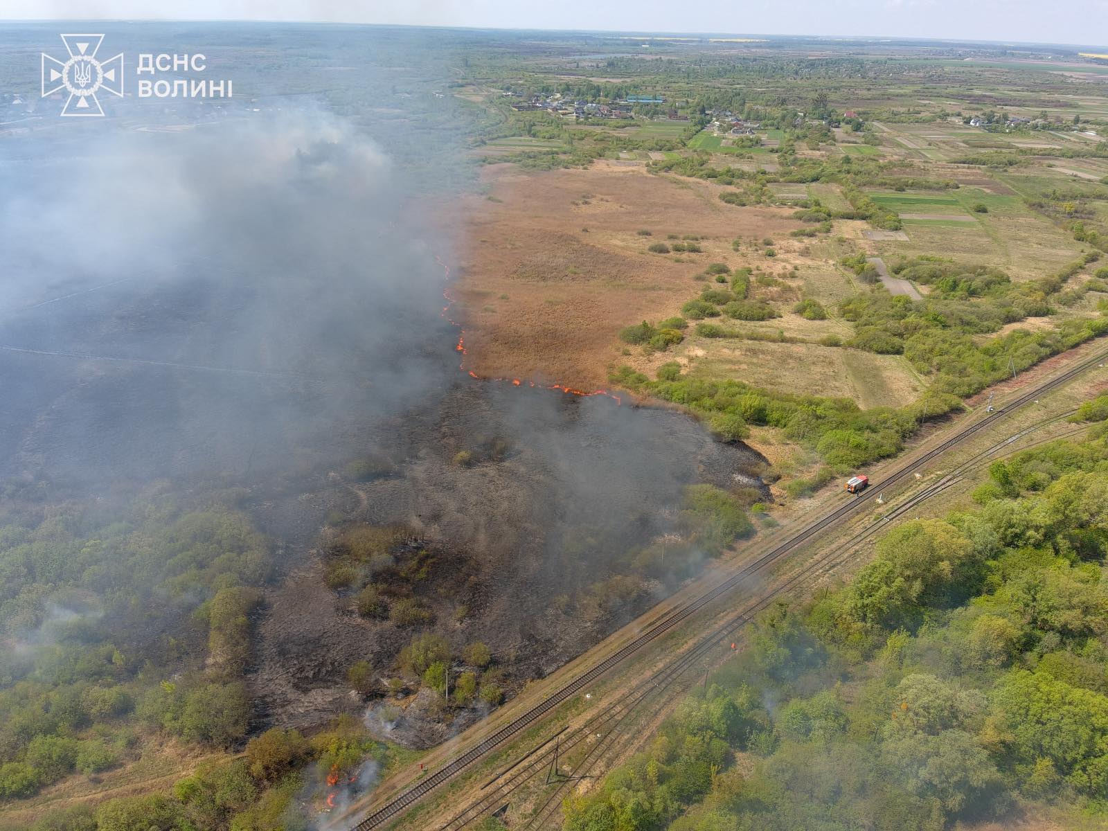 Пожежу посуші зафіксовано поблизу села Майдан Голобської громади. На місці події працювали надзвичайників 21-го державного пожежно-рятувального поста з селища Голоби. Вогнеборці за допомогою водяного ствола приборкали полум’я на площі 2,5 га.