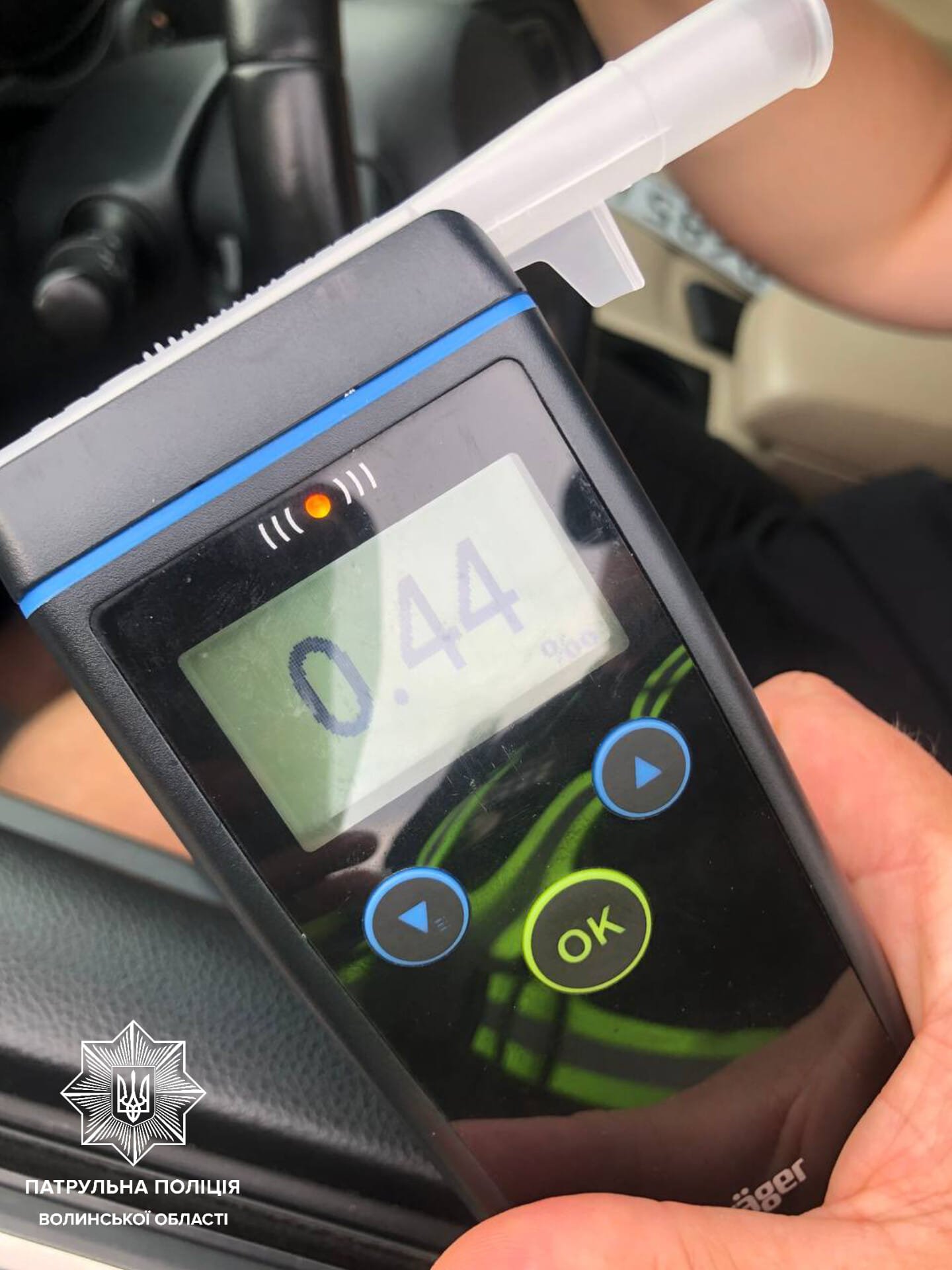 Громадянин не мав посвідчення водія. Крім того, під час спілкування патрульні помітили у нього ознаки алкогольного сп’яніння. Чоловік погодився пройти освідування на місці події, й здогадки поліцейських підтвердилися. Прилад Drager показав результат у 0,44 проміле.На водія інспектори склали адміністративні матеріали за ч. 2 ст. 126 (Керування транспортним засобом особою, яка не має права керування), ч. 1 ст. 130 (Керування у стані сп’яніння), ч. 2 ст. 139 (Пошкодження дорожніх споруд, що спричинили пошкодження транспортних засобів) та ст. 124 (Порушення ПДР, що спричинили пошкодження транспортних засобів) КУпАП.