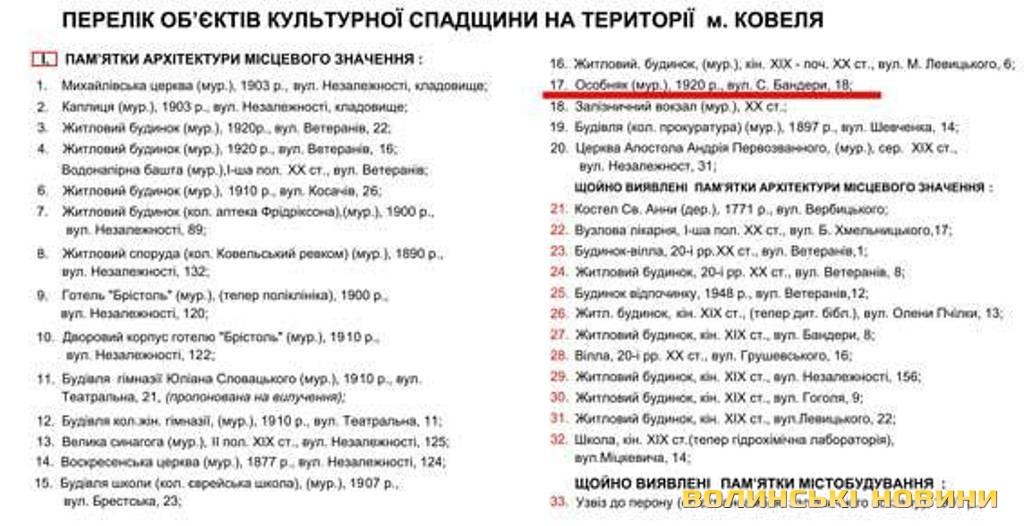 На 31 черговій сесії Ковельської міськради 23 листопада 2017 року у власність Ковельської громади було прийнято другий поверх приміщення колишнього РАЦСу по вул. Степана Бандери, буд. 18 (збудований у 1920р. проживав у ньому єврейський лікар на прізвище Вайтман (Вайсман). Це був приватний особняк польського періоду.) У радянські часи в цьому приміщенні розміщувалася музична школа. Будинок є пам’яткою архітектури місцевого значення.