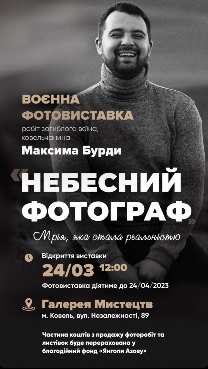 У п’ятницю, 24 березня, у Ковелі відбудеться відкриття воєнної фотовиставки «Небесний фотограф». Захід розпочнеться о 12:00 у Галереї Мистецтв, що на вул. Незалежності, 89. На виставці представлять роботи солдата ЗСУ, фотографа та активіста міста Ковеля – Максима Бурди, який загинув 26 січня 2023 року біля Бахмута.