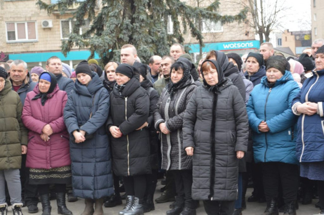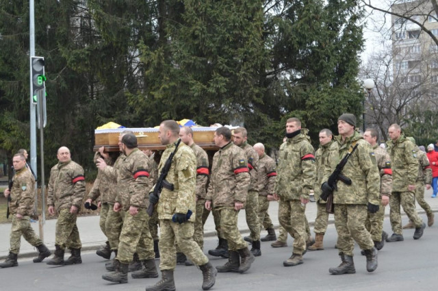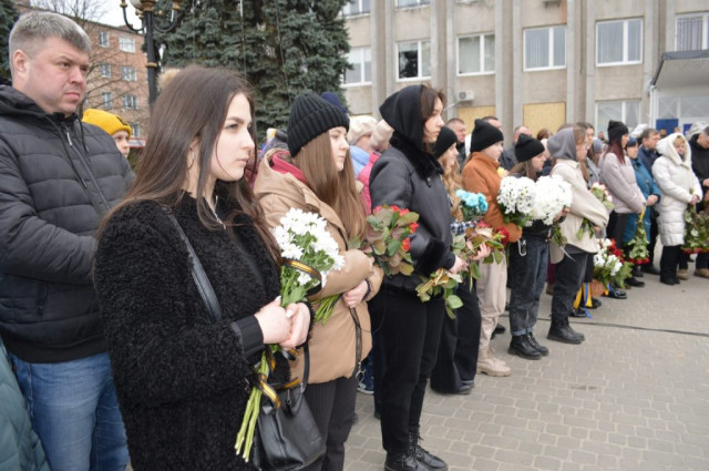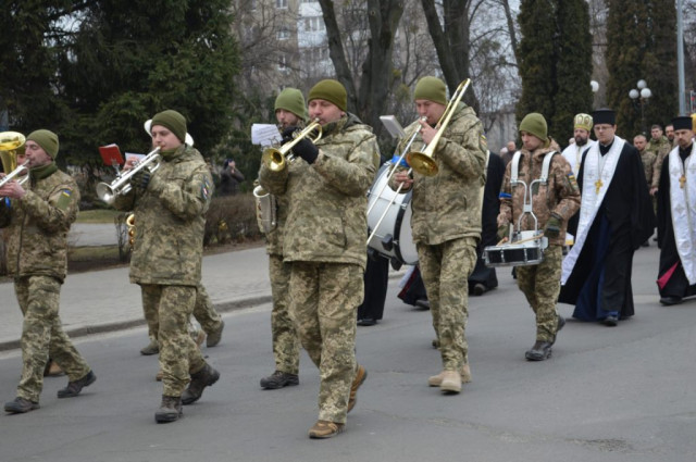 У Благовіщенському соборі відбулась панахида за загиблим у війні військовослужбовцем. Від храму вулицею Незалежності велелюдна процесія пройшла на площу Героїв Майдану.