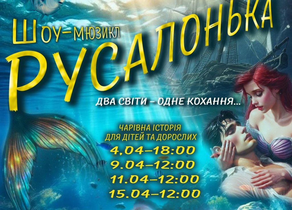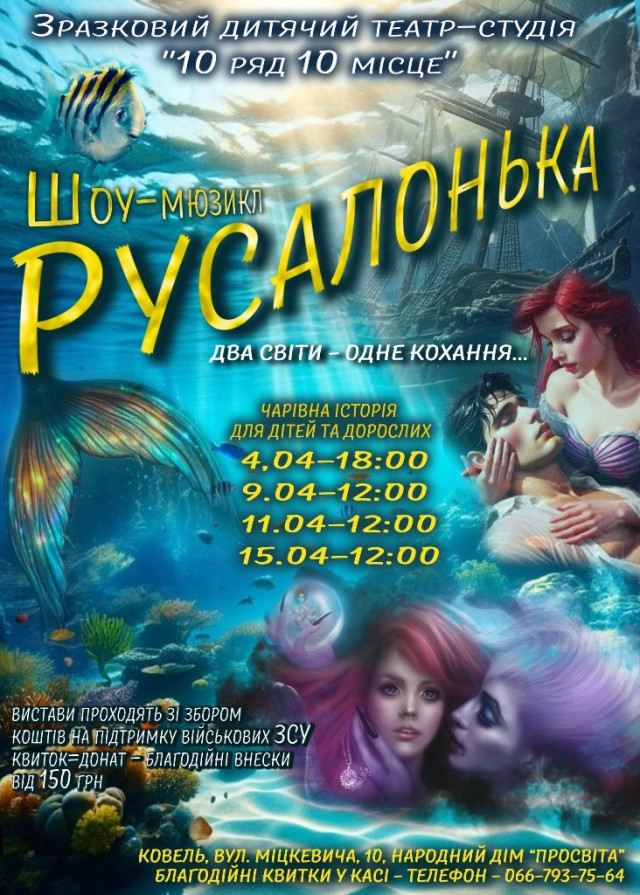 4 квітня о 18:00, 9, 11 та 15 квітня о 12:00 в Ковелі у Народному домі «Просвіта» відбудеться показ шоу-мюзиклу «Русалонька. Два світи – одне кохання» від театру-студії «10 ряд 10 місце».