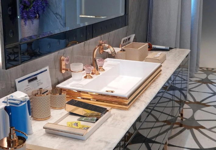 У головному будинку на верхньому поверсі є величезна спальня, в дальньому кутку якої стоїть «опромінювач-рециркулятор повітря» (такі часто ставлять у лікарнях, поліклініках та інших медичних закладах – там всередині ультрафіолетові лампи, які знезаражують повітря, вбивають бактерії і віруси, і такі помічали в кабінеті і кремлівській квартирі Путіна, – ред.).У величезних ванних кімнатах – площею по 50 м² – на підлозі й стінах мармур, а сходи, поручні та джакузі в позолоті.ФБК зазначає, що тільки крани, гачки для одягу і тримачі для туалетного паперу (у вигляді трояндочок в одній ванній кімнаті й у вигляді драконів – в іншій) коштують понад 22 мільйони рублів (понад $280 тисяч).Поверхом нижче розташована приватна лікарня. У ній є кабінет лікаря загальної практики (з апаратом УЗД, столом для масажу, обладнанням для дослідження аналізів, електрокардіографом, апаратом для фізіотерапії тощо) і кабінет стоматолога (зі стоматологічною установкою, рентгенапаратом, операційним стоматологічним мікроскопом, ультразвуком тощо).