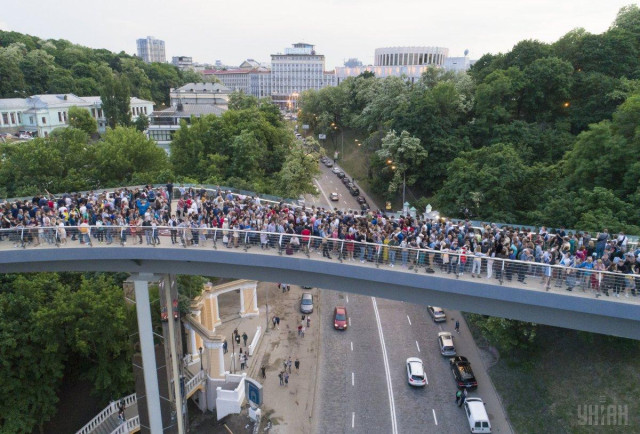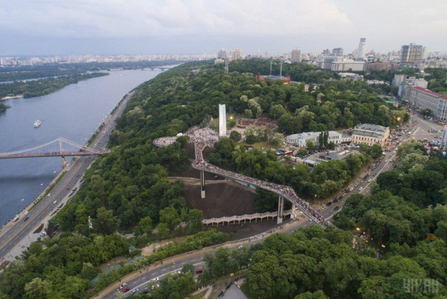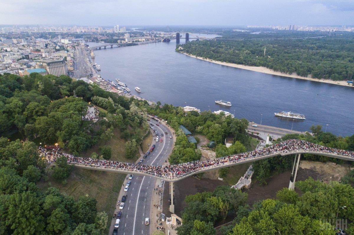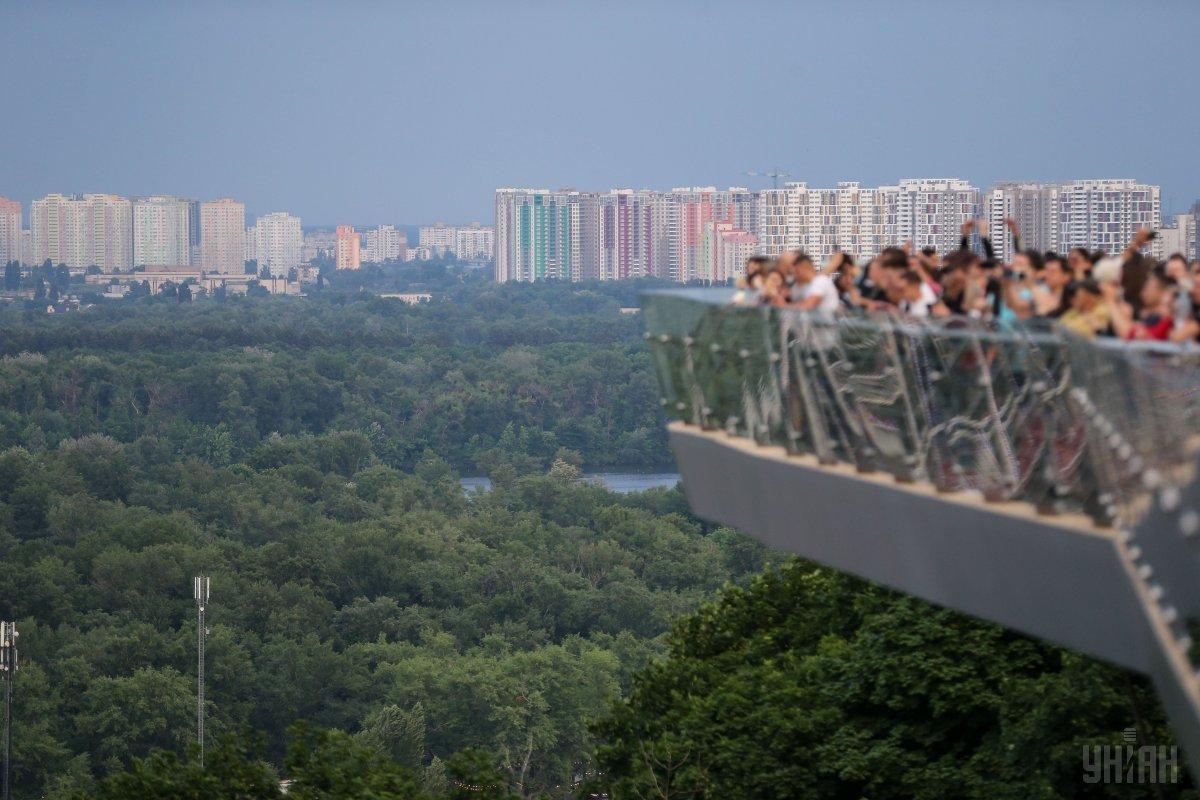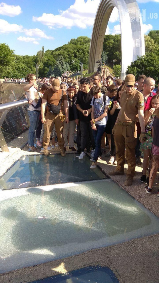 У центрі Києві тріснуло скло оглядового майданчика на новому пішохідно-велосипедний мосту, який побудували між аркою Дружби народів і парк Володимирська гірка. Пошкодження сталося через добу після відкриття мосту, повідомляє ТСН.