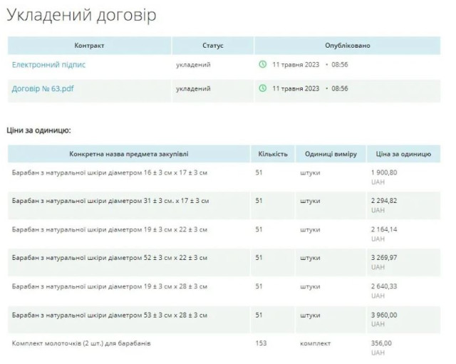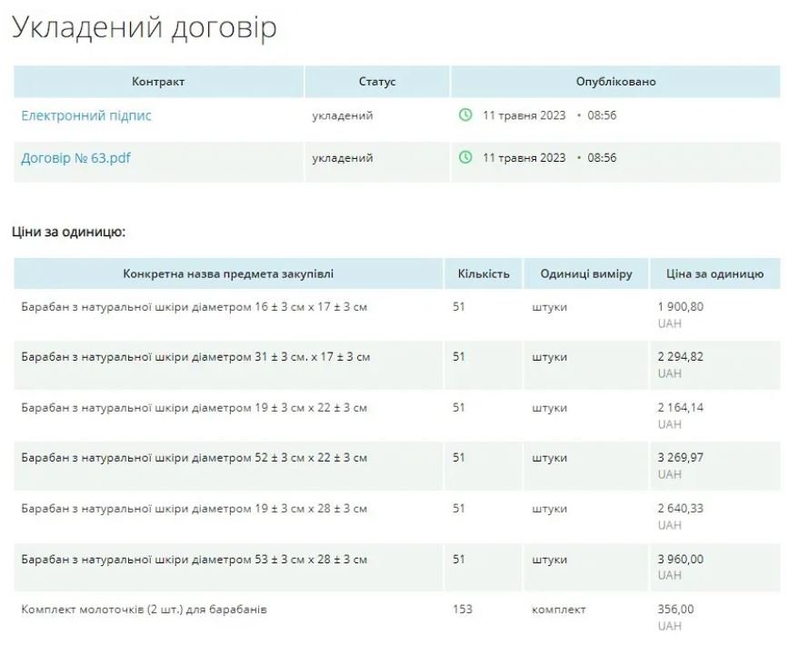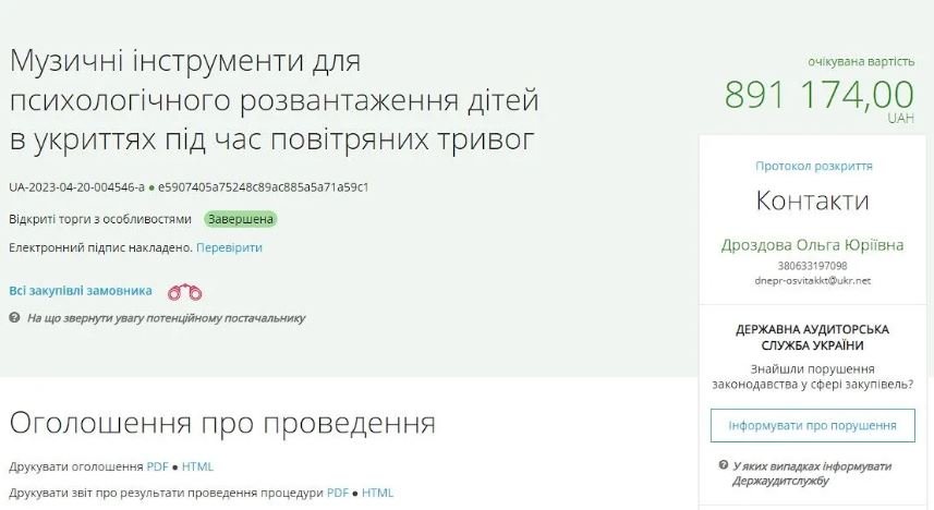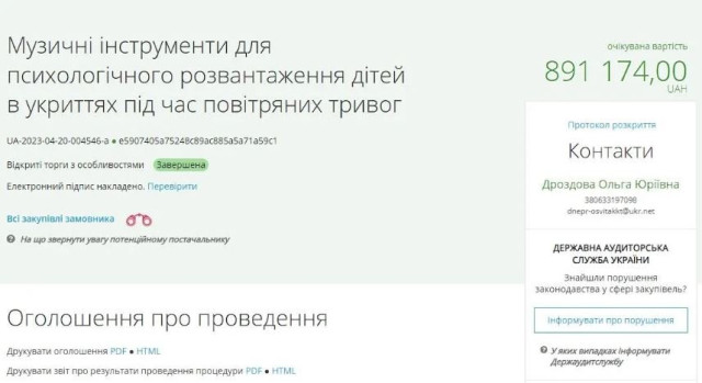«Музичні інструменти для психологічного розвантаження дітей в укриттях під час повітряних тривог», – йдеться в оголошені до тендера.Закупівлю проводило Управління освіти Дніпровської районної державної адміністрації. Загальна вартість 306 барабанів із натуральної шкіри і 153 комплектів молоточків до них становить 891 174 грн. Кожна одиниця тендера коштувала від 1900 до 3960 тис грн залежно від розміру.«Управління освіти має свій бюджет. Вони не погоджують з Дніпровською держадміністрацією свої закупівлі. Вони напряму підпорядковані Департаменту освіти (КМДА)... Це не барабани, це для заспокоєнь, це іграшки для дітей», – запевнив УНІАН по телефону керівник апарату райдержадміністрації Ігор Ластовецький, але порадив дочекатись офіційної відповіді Управління освіти Дніпровської РДА.