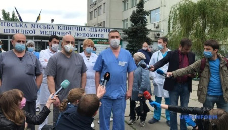 У Києві лікарі клінічної лікарні швидкої медичної допомоги вийшли на акцію протесту в зв’язку зі зниженням їхніх зарплат.