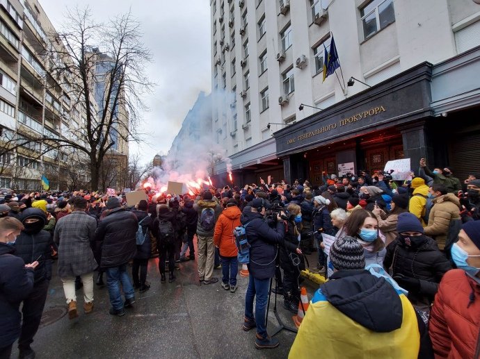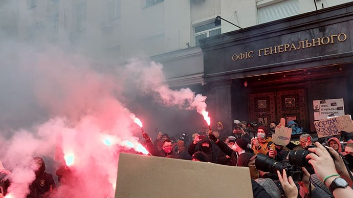 Біля Офісу генпрокурора на Різницькій мітингувальники запалили фаєри.Вони вигукують «Свободу політв’язням!», а також «Венедіктова чума», «Аваков чорт».